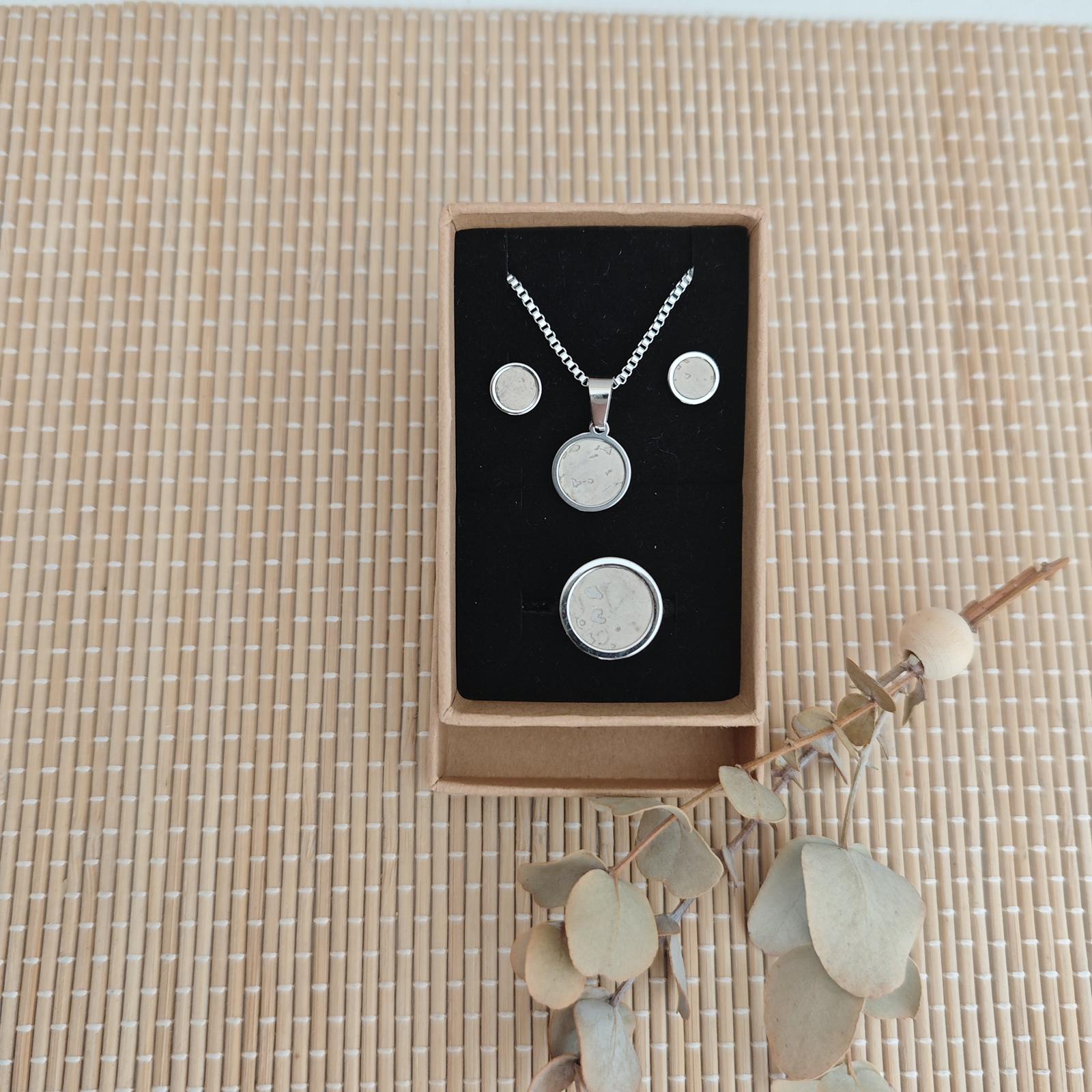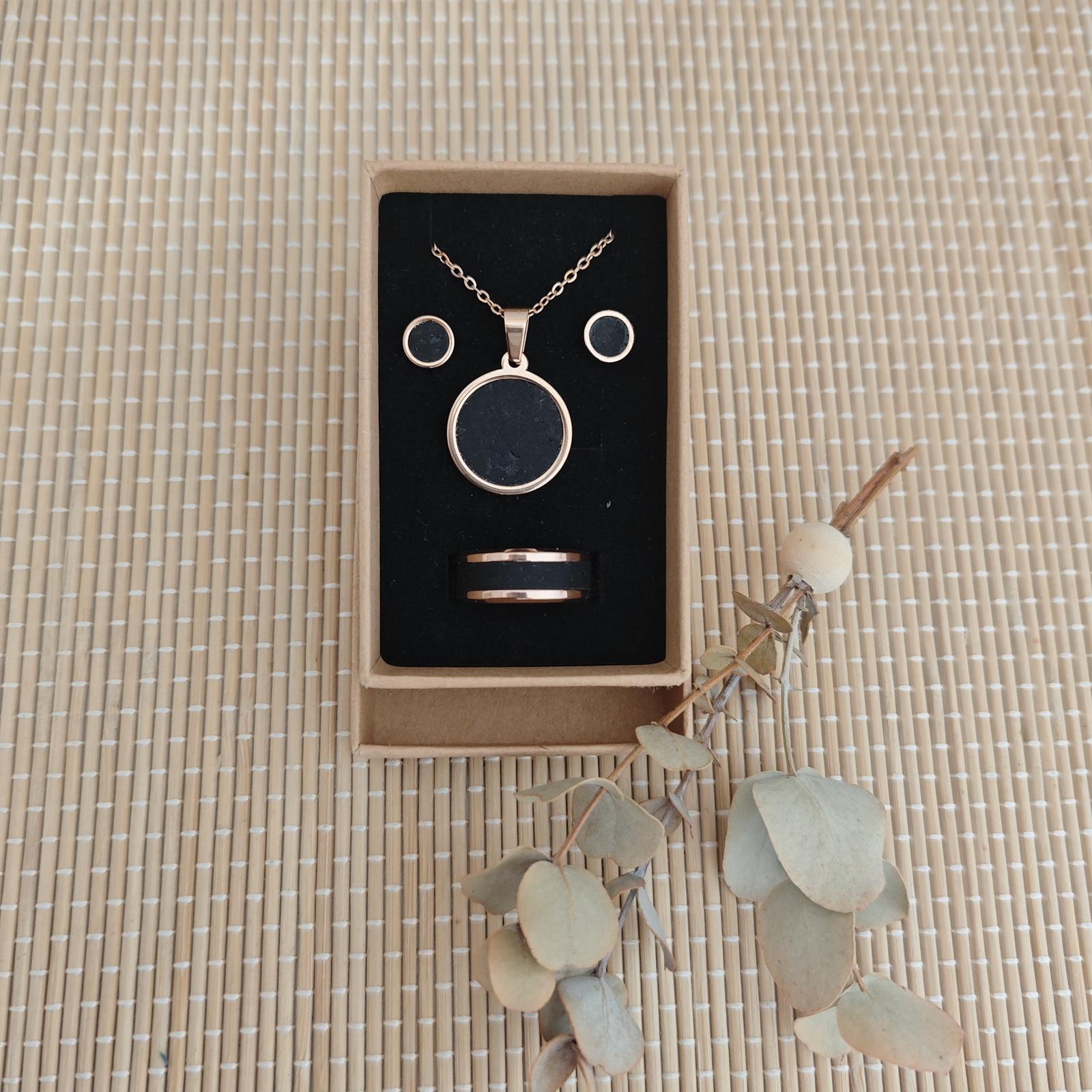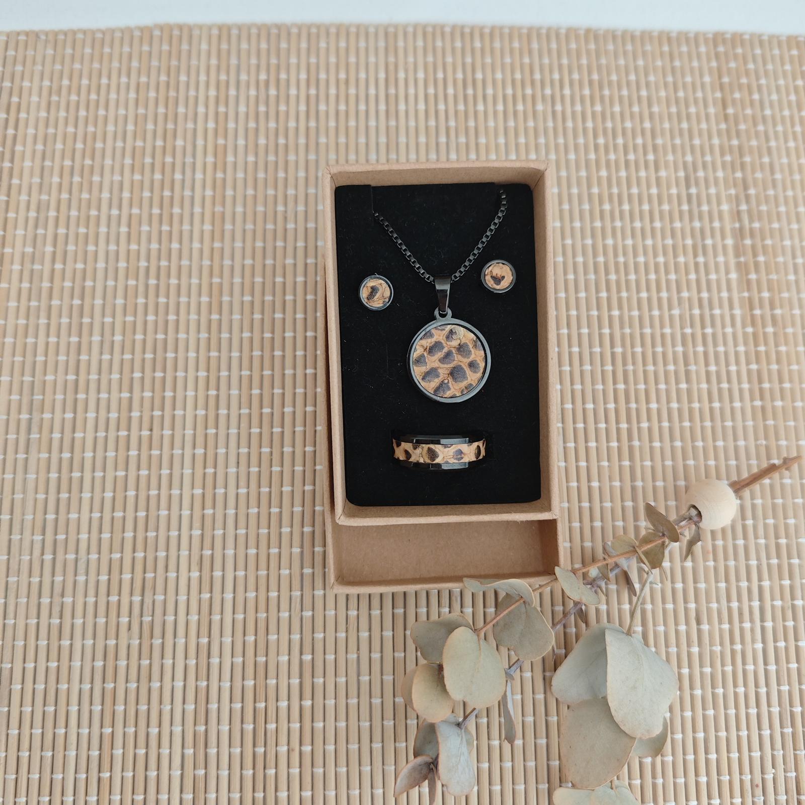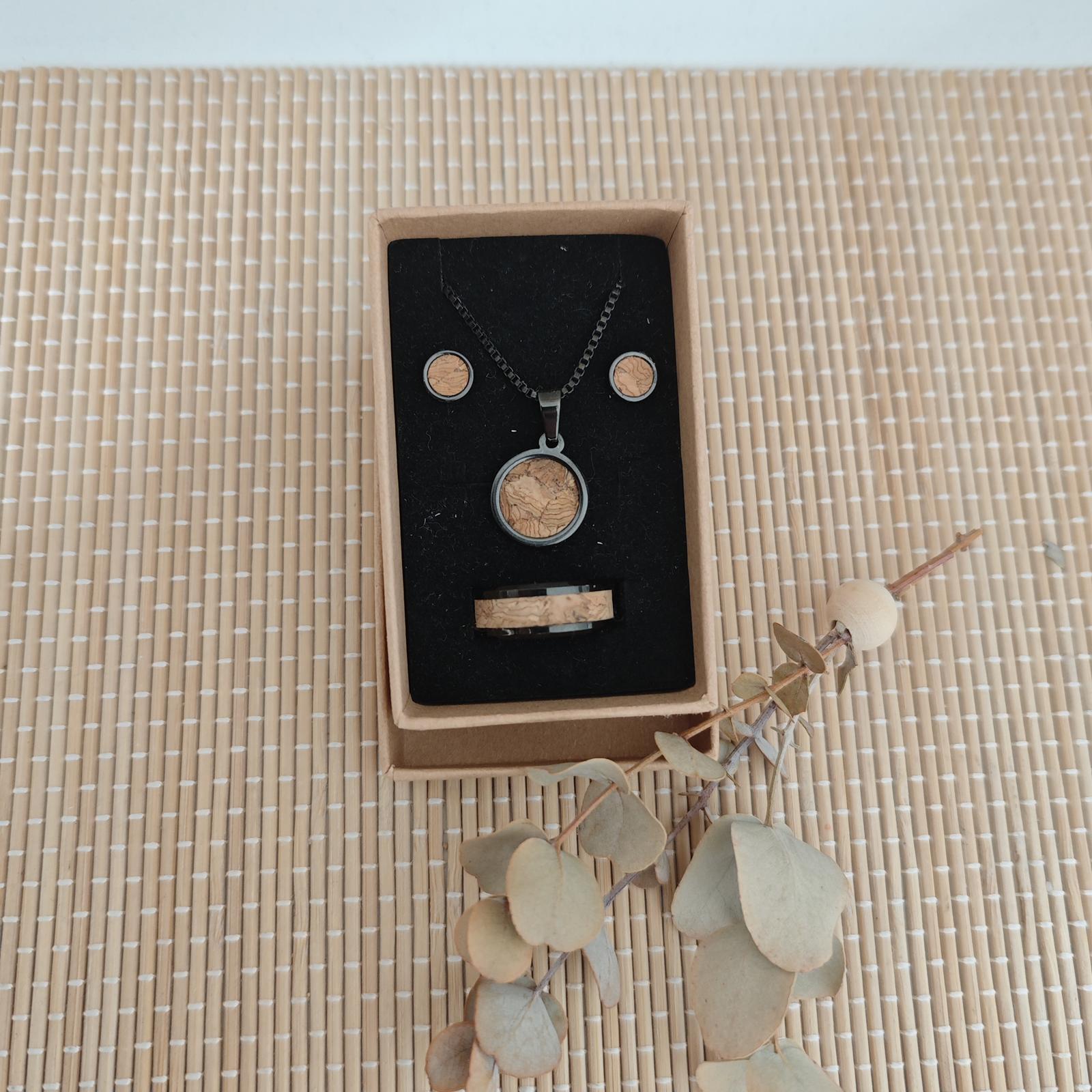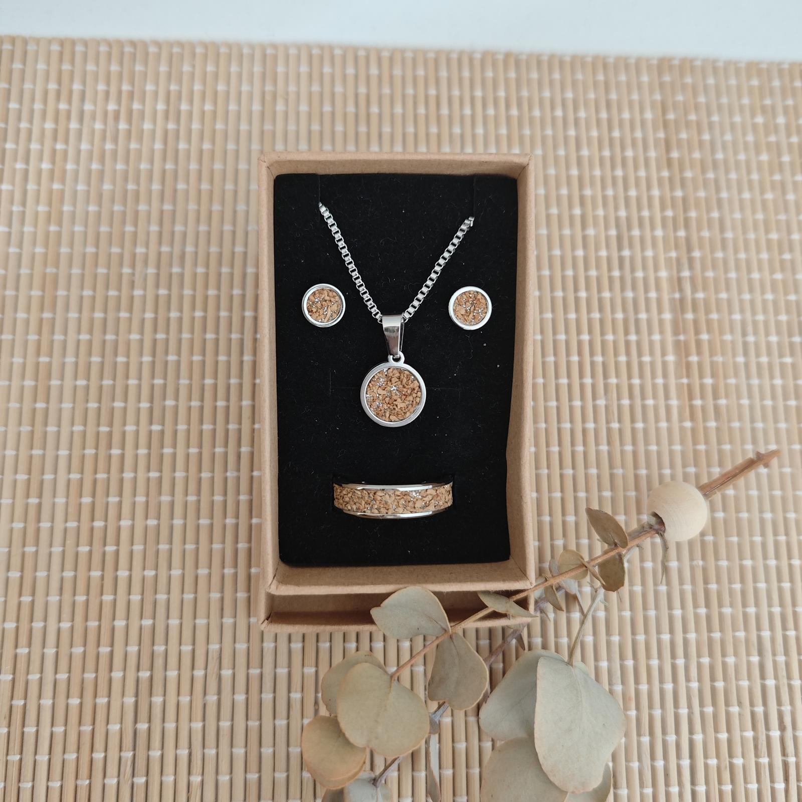 Ohrringe, Fingerring und Kette aus Edelstahl mit Kork-Inlay in Geschenkverpackung - Preis 28,- €