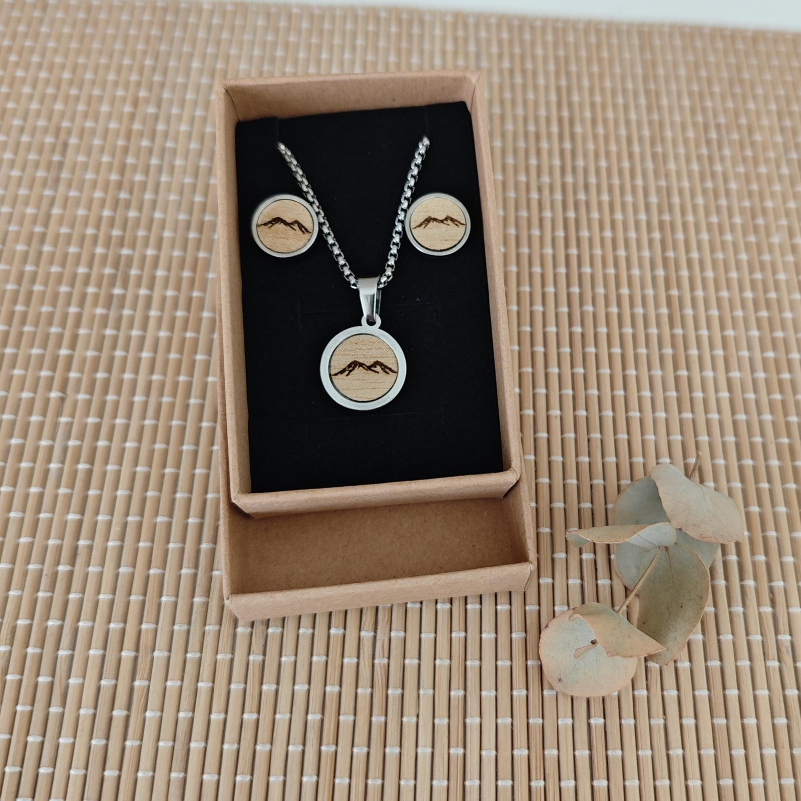 Ohrringe und Kette aus Edelstahl mit Holz-Inlay in Geschenkverpackung - Preis 22,- €